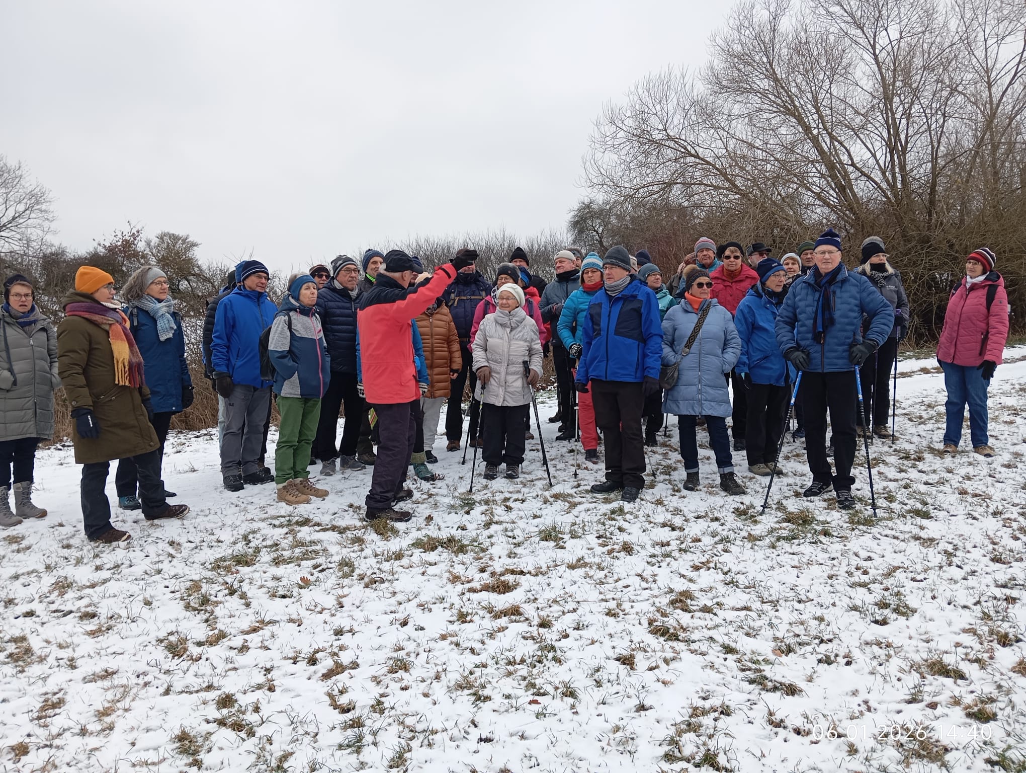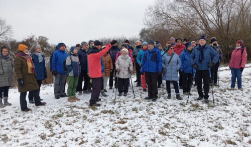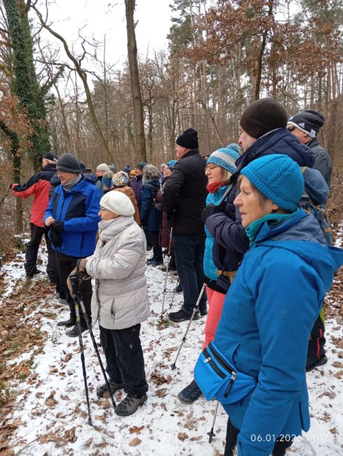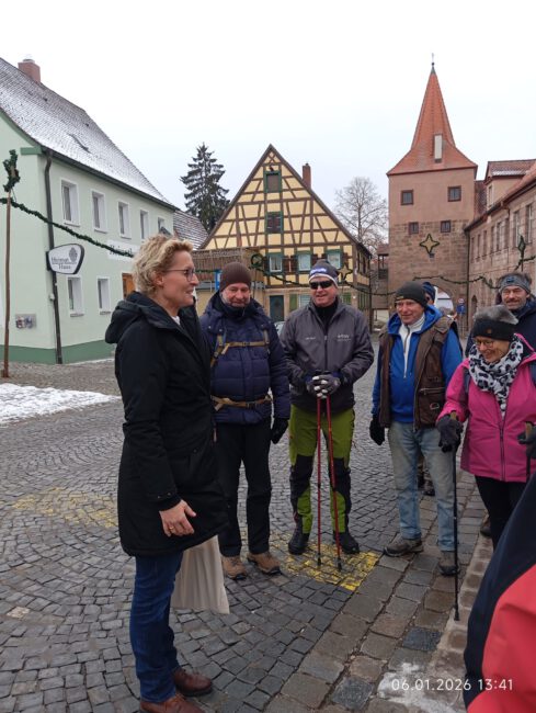 48 Seniorinnen und Senioren trafen sich auf dem Parkplatz des griechischen Restaurants „Garten Kreta“ (früheres Gasthaus Schumann), um an der Jubiläumswanderung mit dem fachkundigen und ehemaligen langjährigen Vorsitzenden der Sektion, Erich Nißlein, teilzunehmen. Das frühere Gasthaus Schumann war 25 Jahre lang Vereinslokal der Sektion und im jetzigen Bürgerhaus (frühere Gaststätte Rotes Roß) fand die Gründung der Sektion am 07.01.1951 statt. Zufälligerweise begegneten wir dort der Bürgermeisterin, Susanne König, die auch Mitglied unserer Sektion ist und uns herzlich begrüßte.