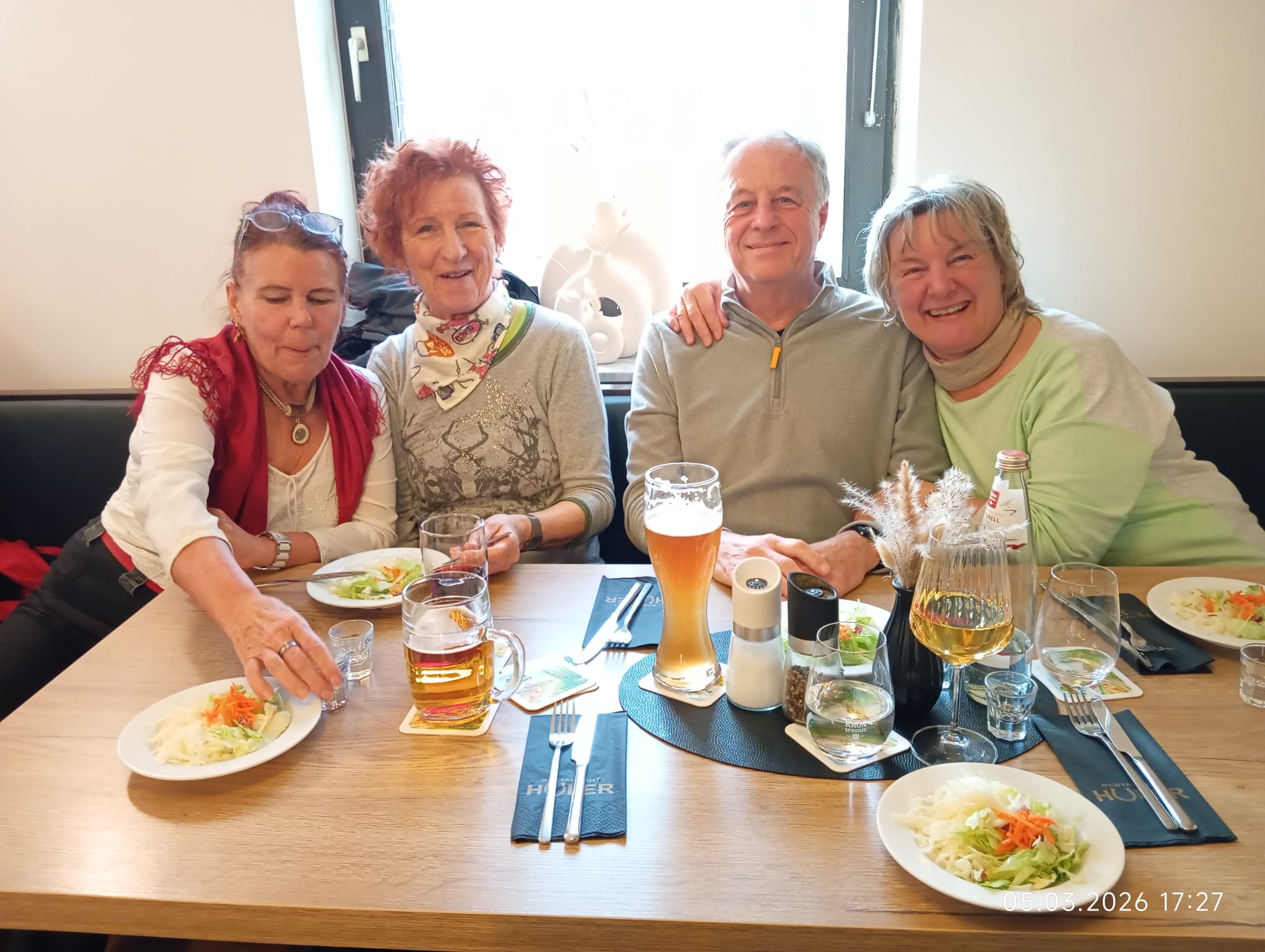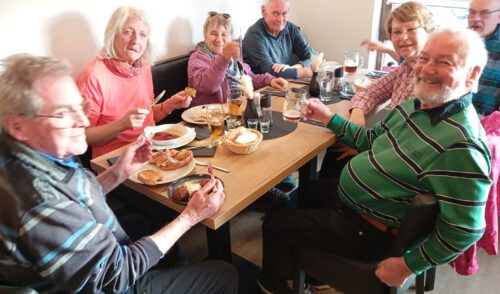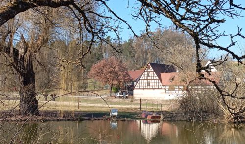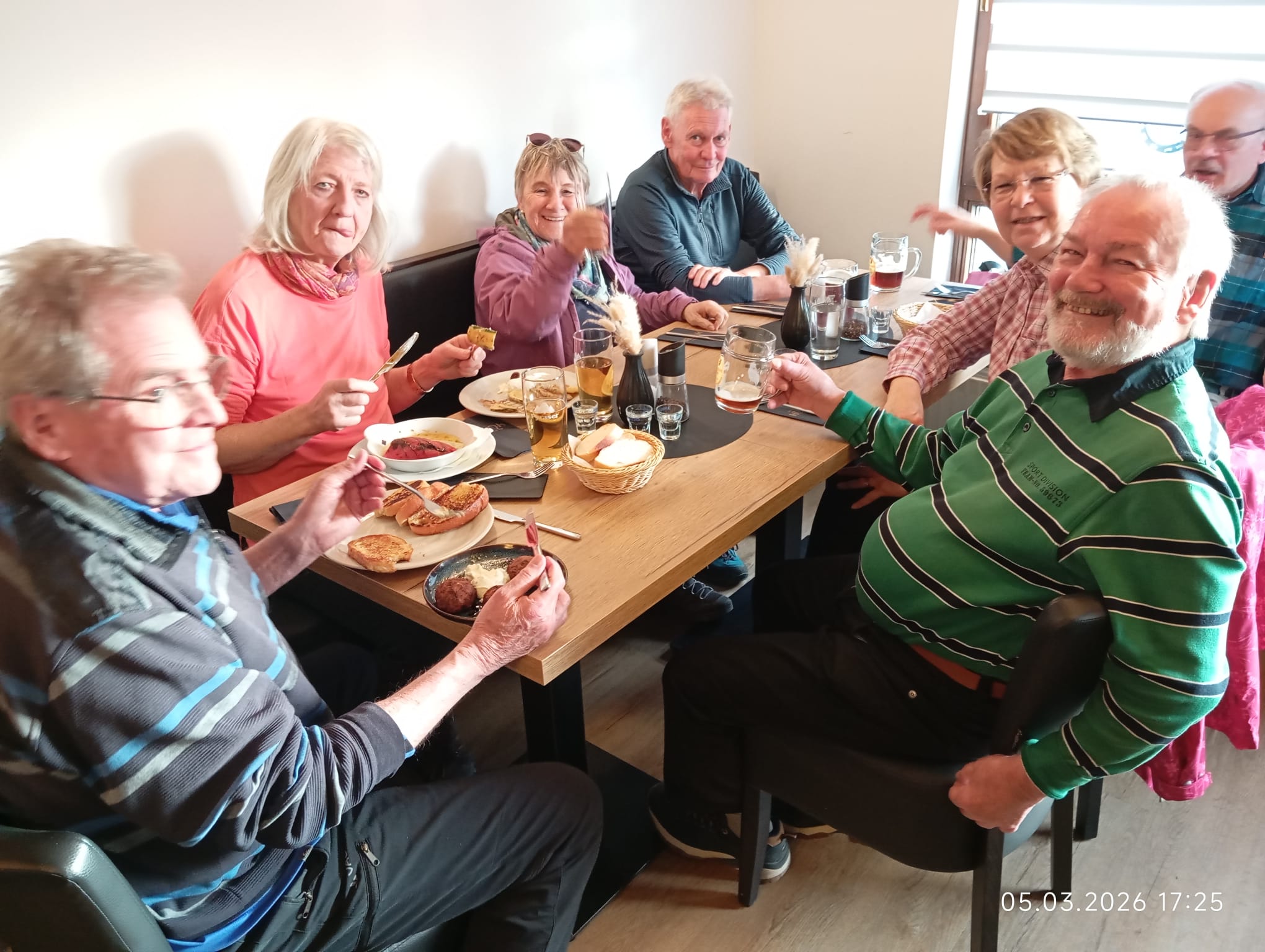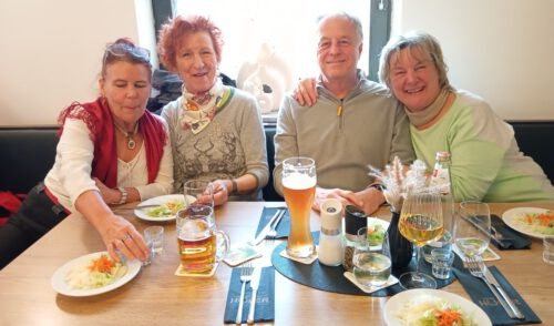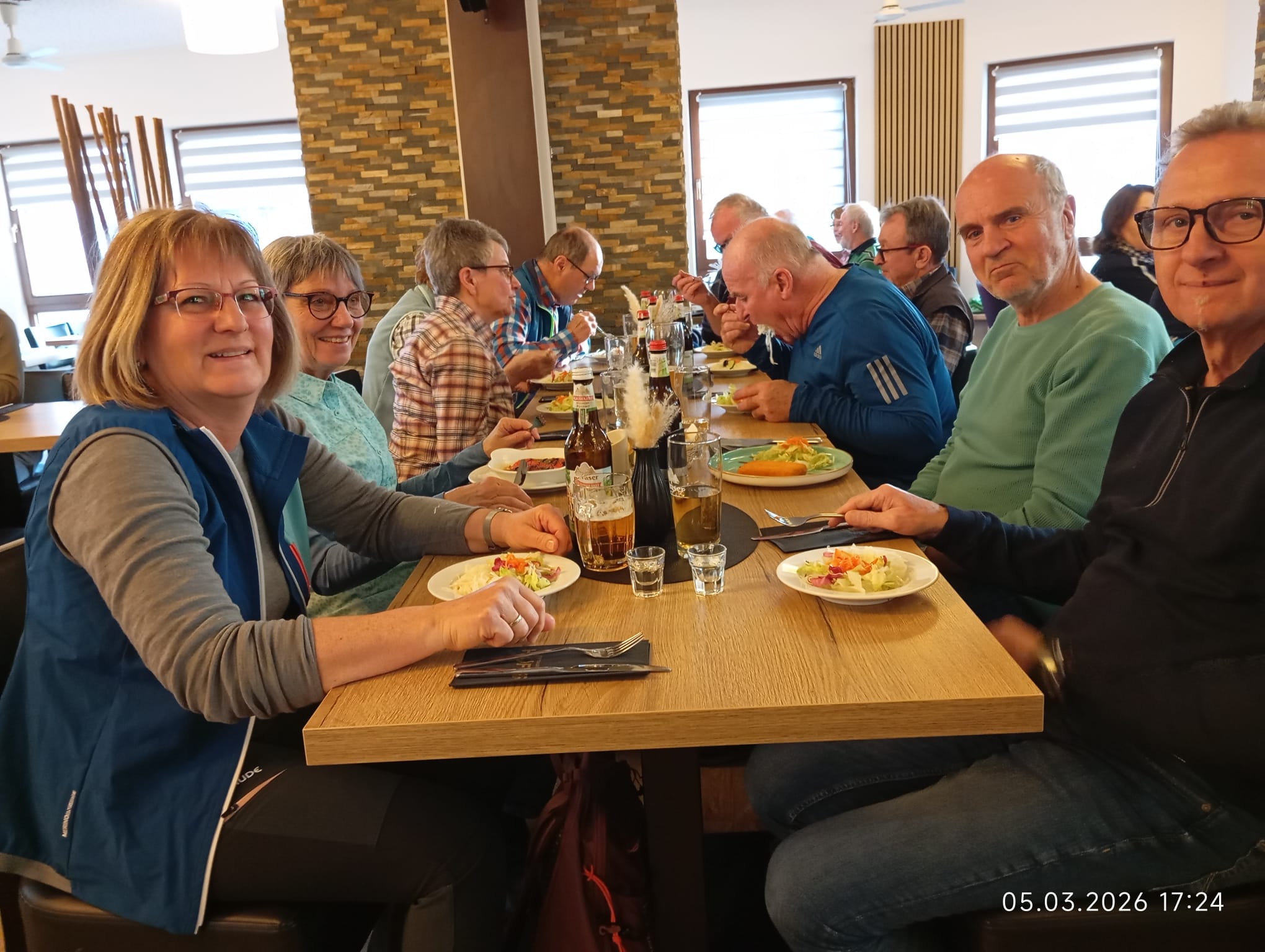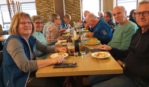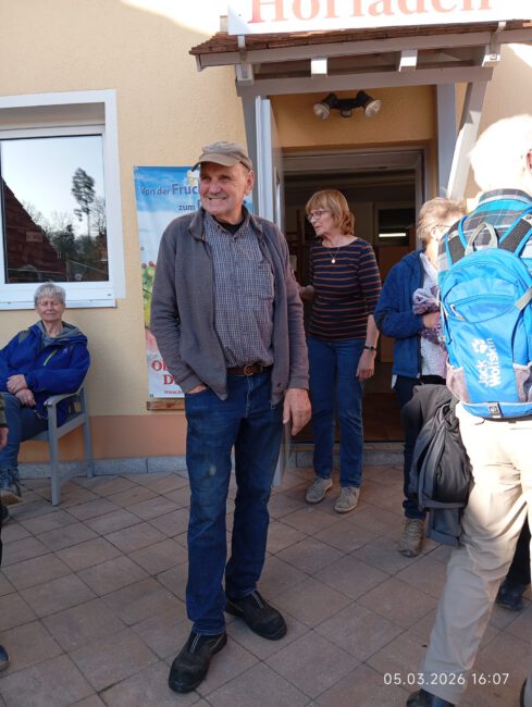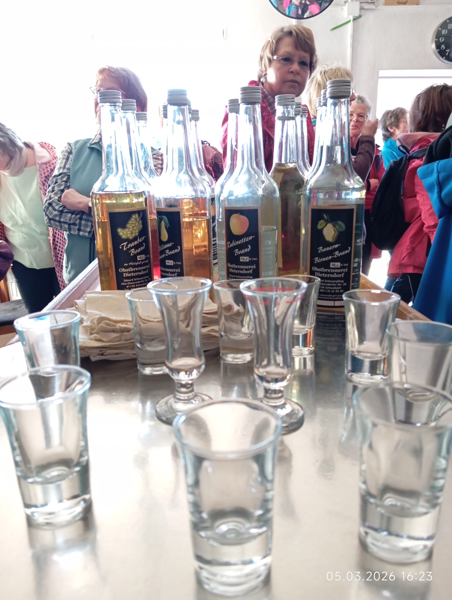 Von dort aus liefen wir im Zwieselbachtal über Nemsdorf nach Hengdorf und aufwärts auf die Hochebene. Der breite Wanderweg war durch die Harvester aufgewühlt, die den „Steckerleswald“ abholzten und der durch Laubbaumschößlinge ersetzt wurde. Wir querten dabei die Straße zwischen Schwabach und Regelsbach und bogen nach ca. 1 ½ Kilometern nach Oberbaimbach ab, um auf dem Rad- und Wanderweg nach insgesamt acht Kilometern nach Dietersdorf zu gelangen. Dort erwartete uns bereits Eduard Scheuerpflug, der eine Besichtigung seiner Brennerei startete, die mittlerweile sehr bekannt ist und für Privatkunden Schnaps und Liköre brennt. Die Kundschaft kommt mittlerweile auch aus Plech, Oberfranken oder aus Ursensollen, Oberpfalz. Nachdem wir den Selbstgebrannten probiert hatten, kehrten wir beim griechischen Restaurant Hufer, der um die Ecke liegt, ein. Dort  tauschten wir uns aus und genossen die Geselligkeit bei „Speis und Trank“.